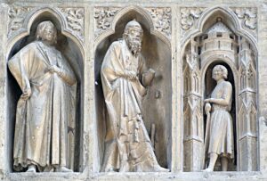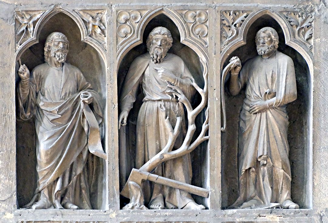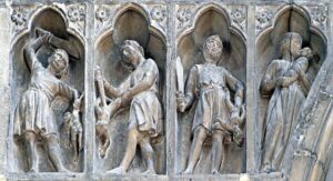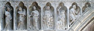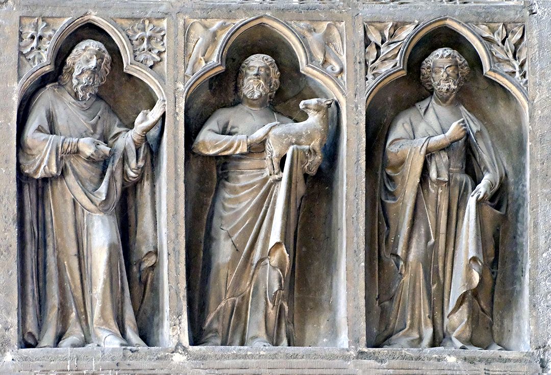 La fuite en Égypte. Les trois premières sculptures à partir de la gauche : Un ange presse Marie qui tient l’enfant Jésus dans les bras et Joseph de partir. Les deux suivantes : Moïse est à genoux devant Dieu qui apparaît dans le buisson ardent..