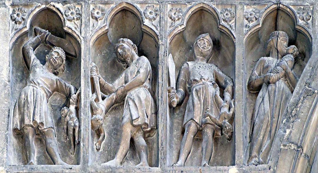 Hérode (à gauche) ordonne aux soldats romains d’éliminer tous les nouveaux-nés.