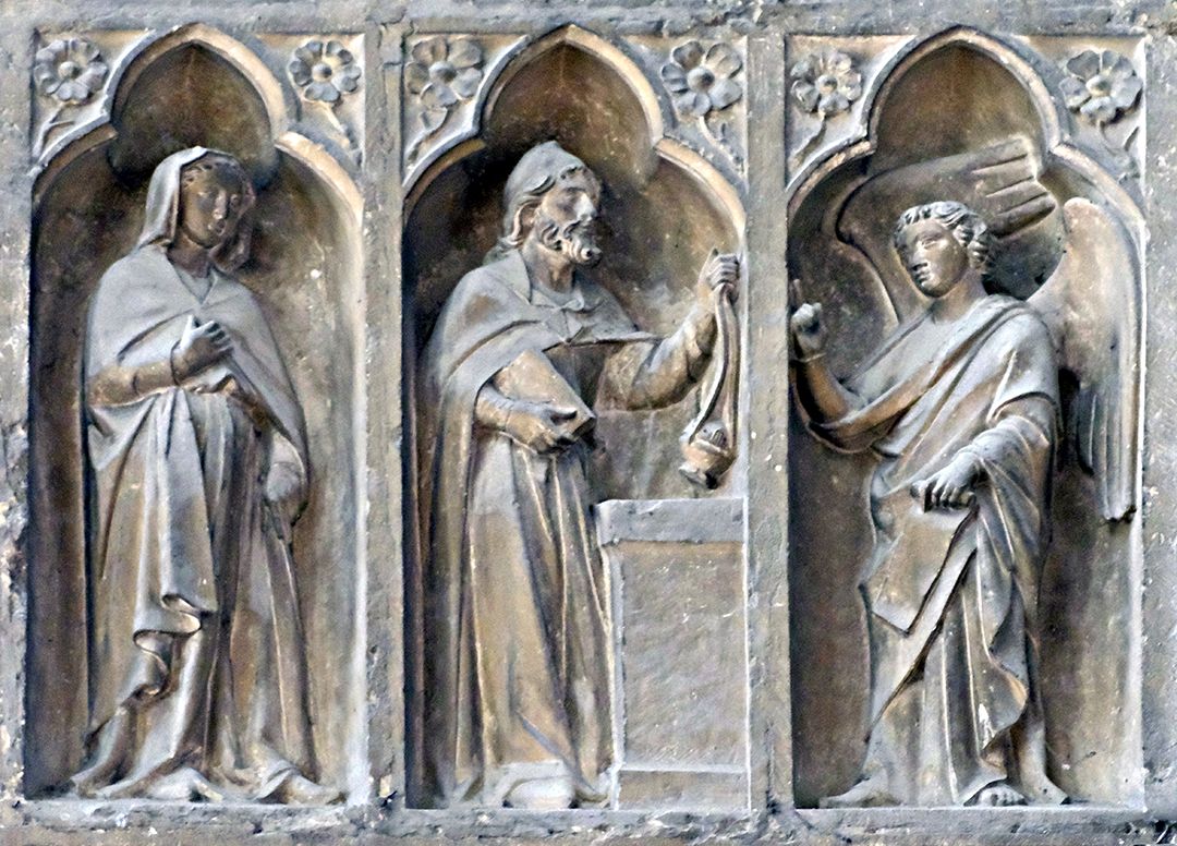 Annonce par un ange (à droite) à Zacharie (au centre) et à Elisabeth (à gauche) de la naissance de Jean-Baptiste.
