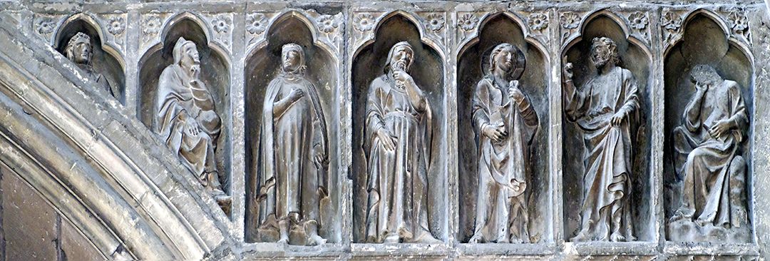 Le décor du revers du portail central est composé de chaque côté de 7 rangées de niches abritant au total 52 statues sculptées en bas-relief et décrites ci-dessous.