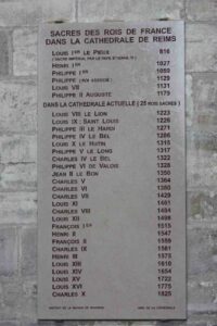 Conscient de l’absence d’un élément important dans la cathédrale des Sacres, le président Bernard Poret a fait ériger une plaque commémorative retraçant les noms des 31 monarques sacrés à Reims (dont 25 dans la cathédrale actuelle) ainsi que la date de chaque cérémonie. Elle est installée dans le bas-côté sud de la cathédrale et le coût de l’opération est partagé entre l’association des Amis de la cathédrale de Reims et l’Institut de la Maison de Bourbon.