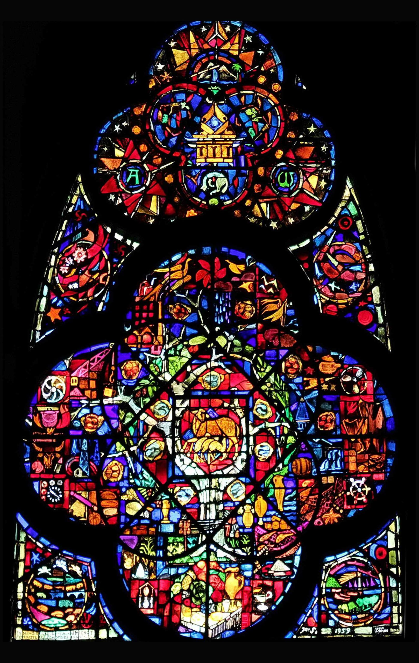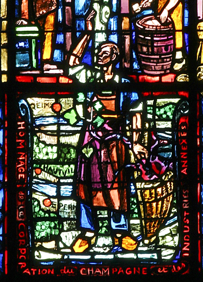 1954, création du vitrail Hommage de la Champagne, financé grâce au mécénat de la profession et réalisé par Jacques Simon.